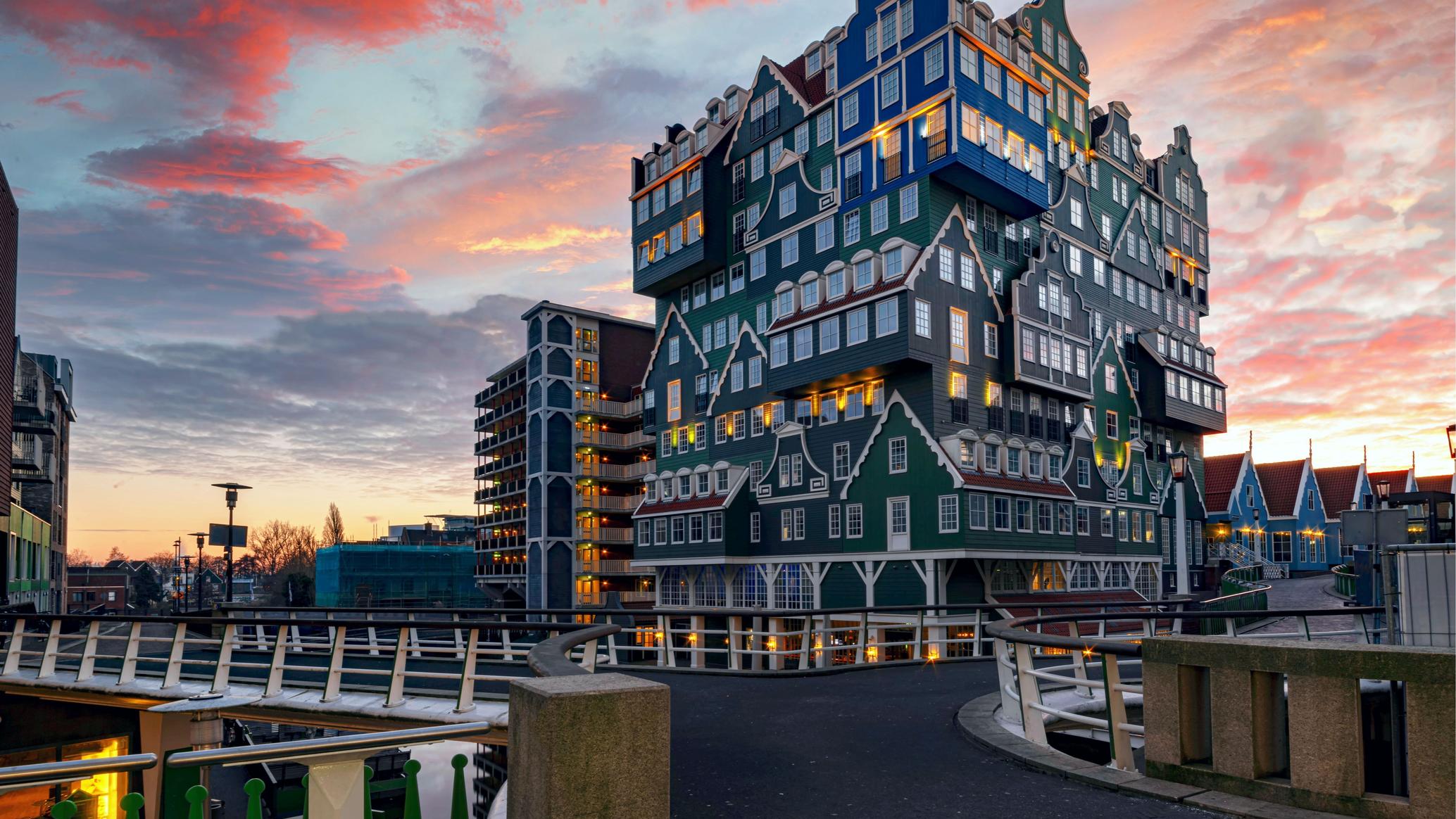 El Inntel Hotel Zaandam es el motivo principal por el que miles de turistas llegan hasta acá. Imagina una torre moderna compuesta por 63 casitas neerlandesas de estilos diferentes, apiladas una sobre otra como si alguien hubiera jugado con bloques gigantes.